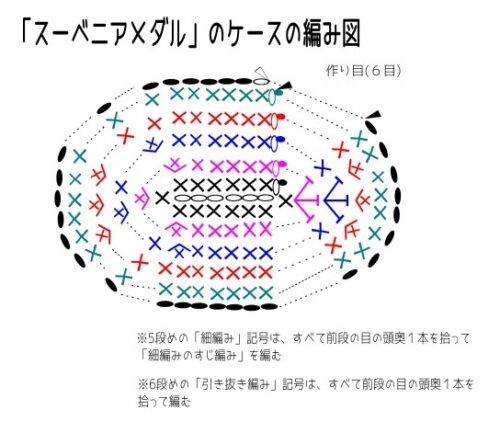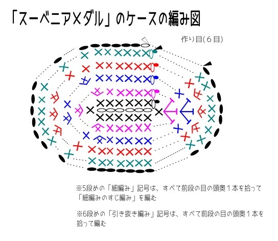 編み図をクリックしていただくと、画像が大きくなります。「鎖編み」6目の作り目から編みはじめ、楕円形になるように編んでいきます。メダルの形がたまごの形なので、上下で増やし目が少し違います。気を付けてください。