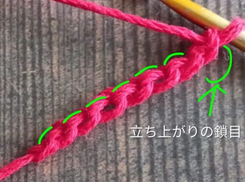 1.はじめに、「鎖編み」を6目編みます。次に、立ち上がりの「鎖編み」を1目編みます。続いて、鎖目の裏山(画像のみどりの線)を拾って「細編み」を6目編みます。