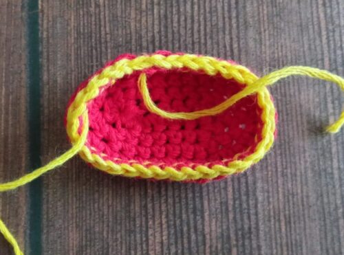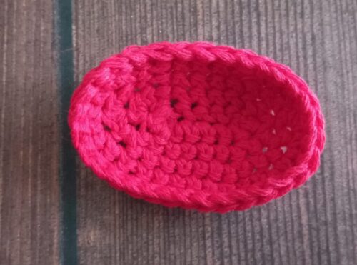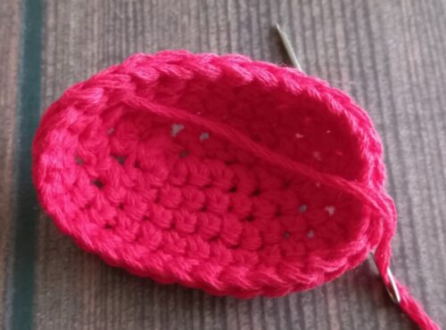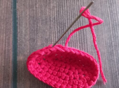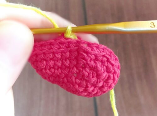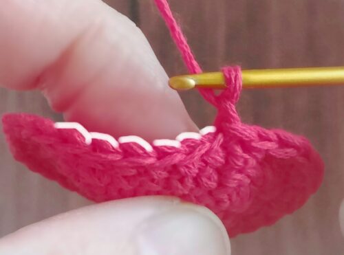 同様に繰り返し、「引き抜き編み」を目数の増減無しで1周編んだあと、手順4と同様に「わ」の編み終わりの処理をします。