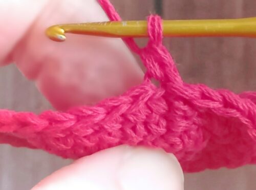「細編み」を編みます。「細編みのすじ編み」が1目編めました。