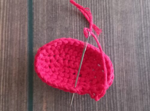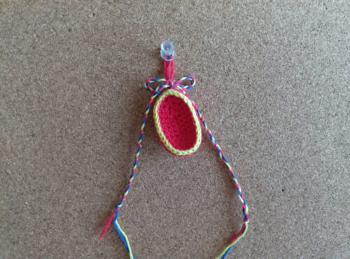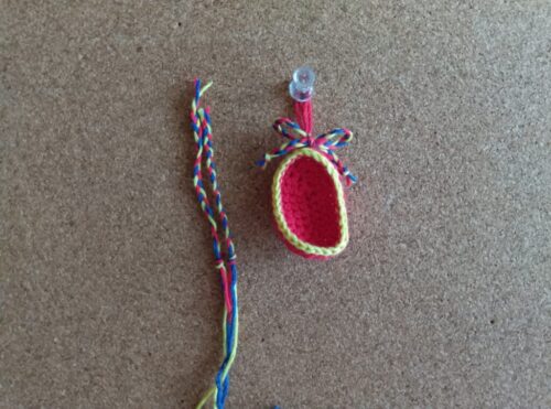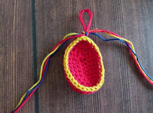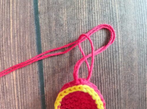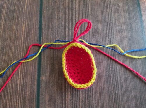 6.ケースをかける糸を付けます。赤、黄の糸をそれぞれ約50cmほどにカットし、赤い糸を半分に折ります。たまご形の上部に画像のようにかぎ針を通し、半分に折った糸の中央の「わ」を針先にかけます。