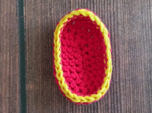 4.5段めがすべて編み終わったら、最後の目は「わ」の編み終わりの処理をします。