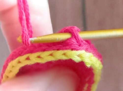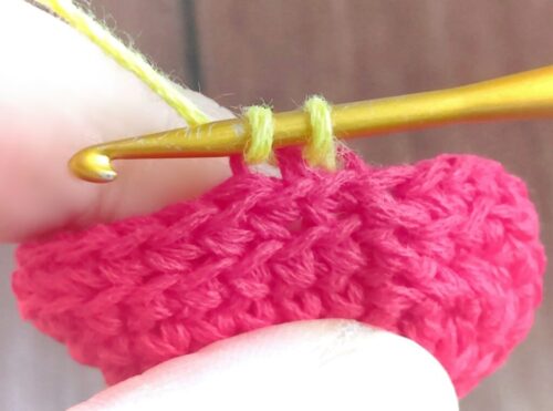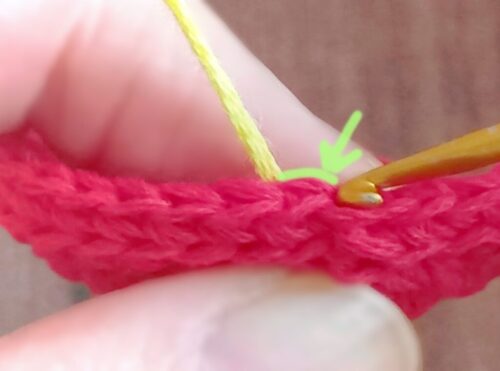 5.6段めは、糸の色を変えて「引き抜き編み」を編みます。編みはじめの糸をつける位置はどこでも大丈夫です。前段の目の頭半目(画像のみどりの線)にかぎ針を入れ、