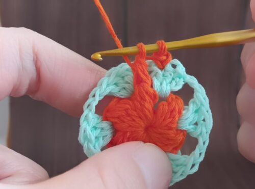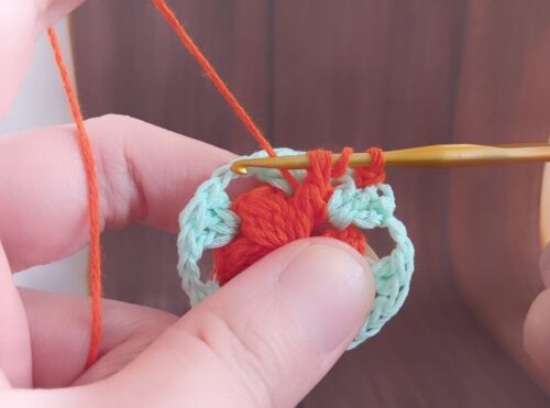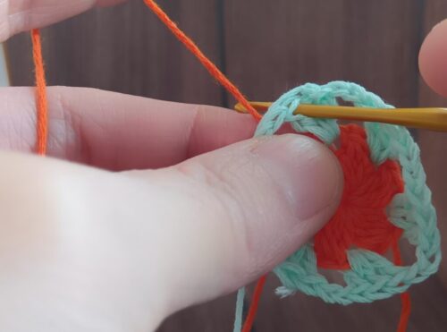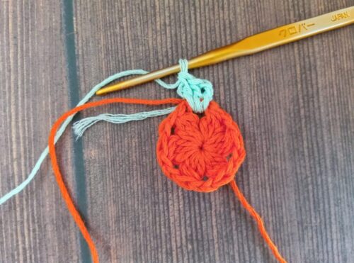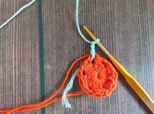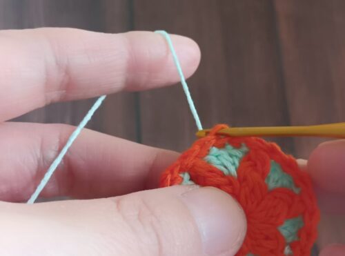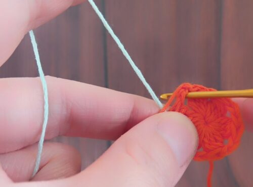 2.編み糸を持ち替えて、編みはじめの位置にかぎ針を入れます。