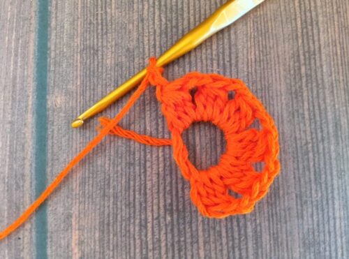 引き続き編み図の通りに編み進め、2段めを編みます。最後の「引き抜き編み」を編み終わったら、1段めと同様に編み終わりの処理をしてください。