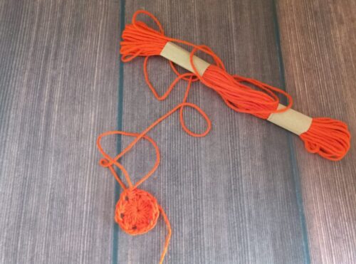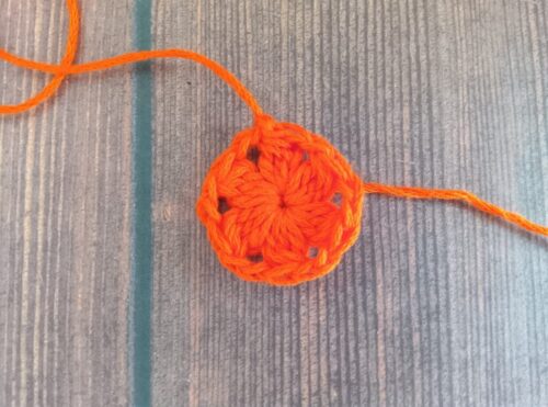 続けて編み図のとおりに繰り返し、5段めの編み終わりは「わ」の編み終わりの処理をして編み糸をカットします。糸端を編地の目立たない所に処理をして完成です!