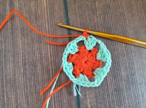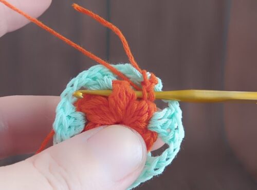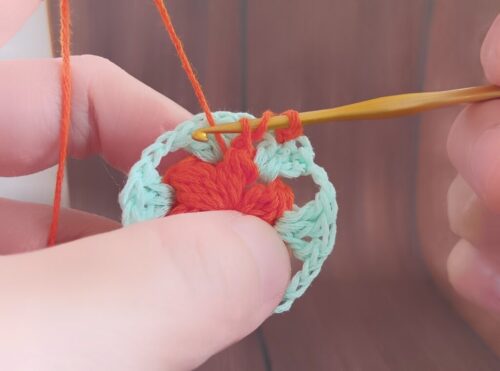 3.3段めを編んでいきます。1段めに使用した糸に持ち替えて、編みはじめの位置にかぎ針を入れてください。