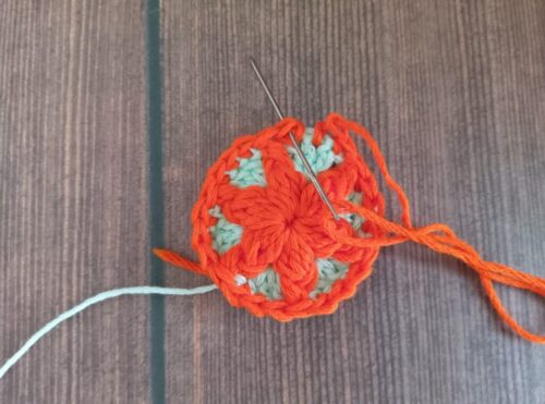3段めの編み終わりは「わ」の編み終わりの処理をします。ループを引き伸ばしてかぎ針を抜き、編み糸をカットして閉じ針に通します。そのまま編みはじめの1目めに針を入れ、糸を通します。