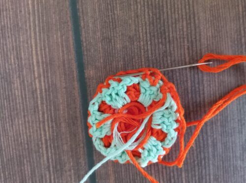 そのまま、編地の目立たないところ数目に針を通し、糸をカットします。他に残しておいた糸端も、編地の目立たない所に通してカットしてください。