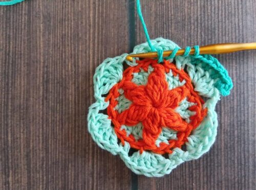 同様に編み図のとおりに、2段めの長編み目に「細編み」1目を3回+1段めの玉編み目に「変わり中長編み2目の玉編み」の引き上げ編みを1目編み入れていきます。