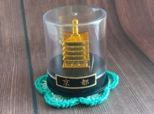 旅行のお土産リクエストを聞かれたとき、私はいつも「その土地ならではの小さな置物」をお願いしています。昨年の秋ごろ京都へ旅行に行った娘が、五重塔の置物を買ってきてくれました。今回はその置物を部屋に飾るための、小さなドイリーを編みました。