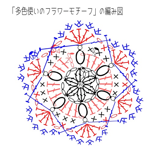 ※材料は3色で編んだモチーフの分量をご紹介しています。2色で編んだモチーフは、1、3、5段で1色、2、4段で1色使用しています。